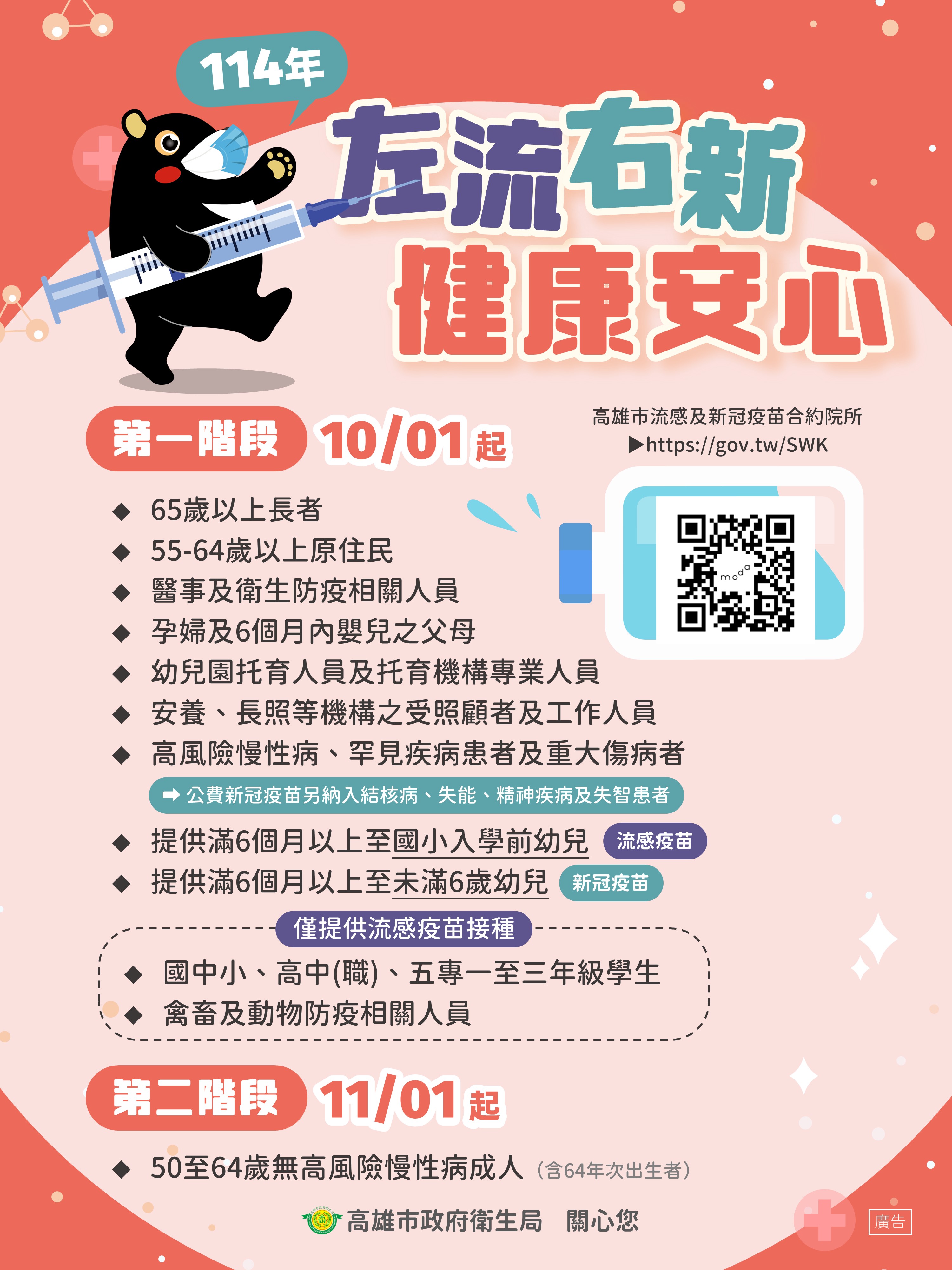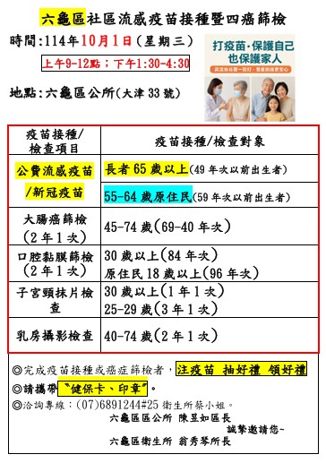 114年10月1日(星期三)六龜衛生所流感疫苗接種站施打消息