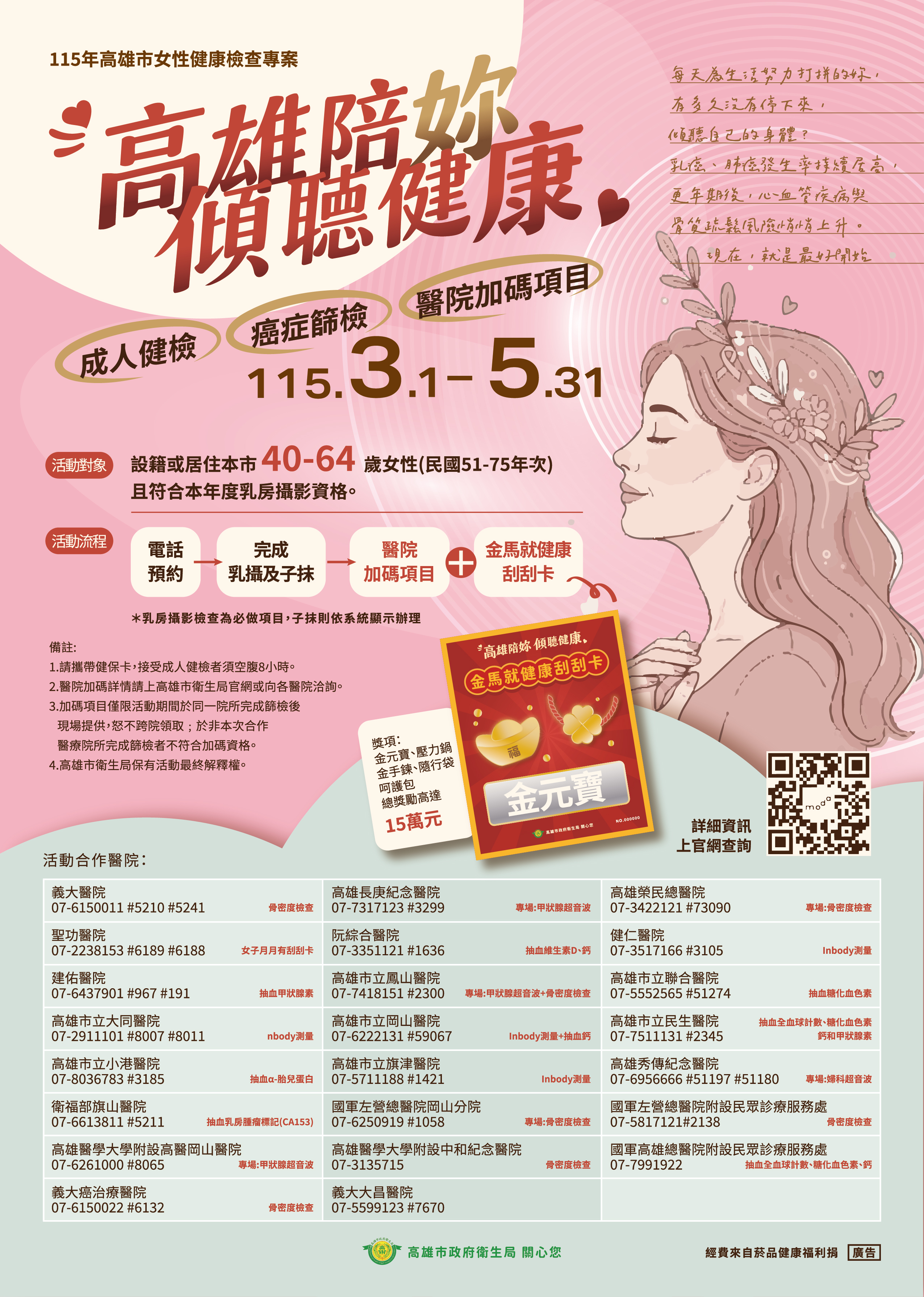 115年婦女專案-高雄陪妳 傾聽健康 本年度衛生局再次與23家院所共同辦理 凡於「活動期間」在「活動院所」完成「乳攝及子抹」的民眾贈送金馬就健康刮刮卡和醫院加贈項目 📍活動對象:設籍或現居本市40-64歲女性(民國51-75年次),且符合本年度乳房攝影資格。 📍活動期間:115/3/1-115/5/31 📍活動好禮:金元寶、萬用鍋、金手鍊、隨行袋和呵護包,總價值高達15萬
